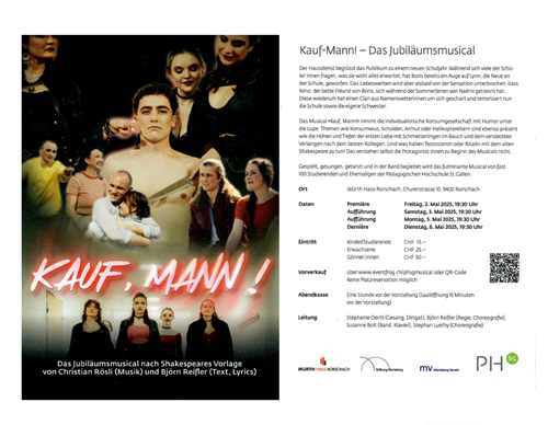 Das Musical «Kauf, Mann!» nimmt die individualistische Konsumgesellschaft mit Humor unter die Lupe. Themen wie Konsumwut, Schulden, Armut oder Helikoptereltern sind ebenso präsent wie die Höhen und Tiefen der ersten Liebe mit ihren Schmetterlingen im Bauch und dem versteckten Verlangen nach dem besten Kollegen. Und was hat Testosteron oder Ritalin mit dem alten Shakespeare zu tun? Das verstehen selbst die Protagonistinnen und Protagonisten zu Beginn des Musicals nicht.